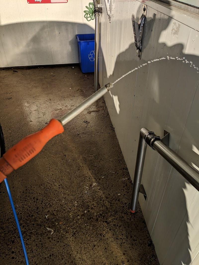 Spray on cleaner, turns blood red, power wash off. All done!